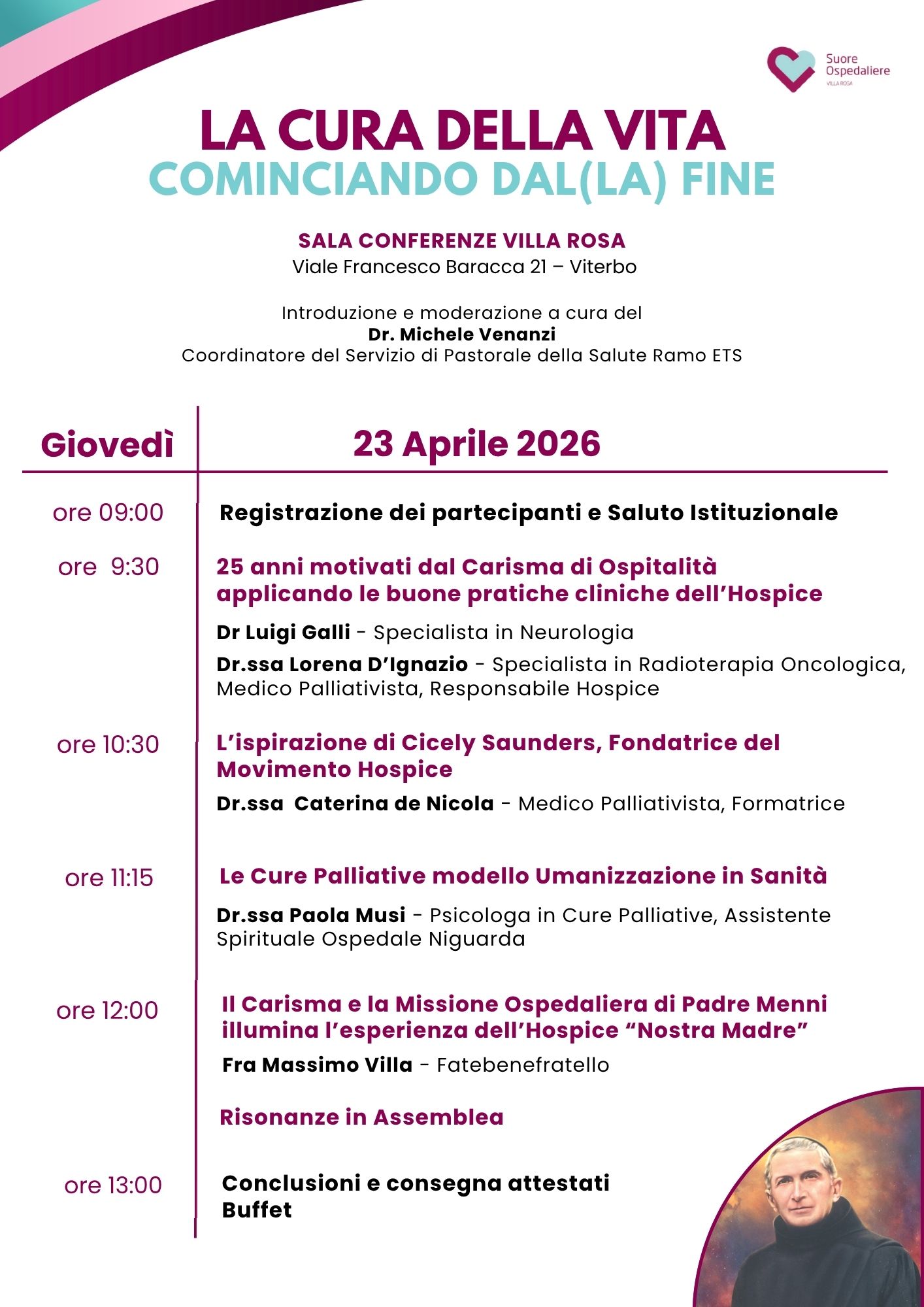 L’evento assume un valore ancora più significativo in quanto coincide con il 25° anniversario dell’Hospice “Nostra Madre”, servizio attivo presso la struttura viterbese delle Suore Ospedaliere. Da un quarto di secolo, l’Hospice rappresenta un punto di riferimento nell’accompagnamento dei pazienti nella fase terminale della malattia, offrendo assistenza qualificata e supporto umano ai malati e alle loro famiglie.
